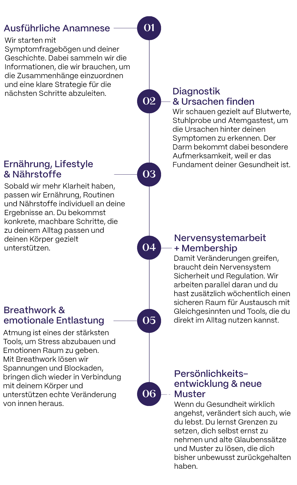 Du bekommst keine pauschale Lösung, sondern eine individualisierte Ursachenforschung mit Struktur. Wir finden den roten Faden in deinen Symptomen (Darm, Hormone, Nervensystem) und entwickeln daraus eine Strategie, die im Alltag umsetzbar ist.